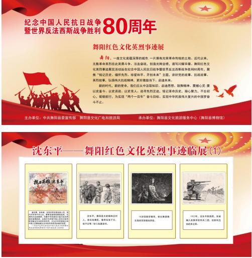 2025年8月15日,由中共舞陽縣委宣傳部、舞陽縣文化廣電和旅游局主辦,舞陽縣文化旅游服務(wù)中心(舞陽縣博物館)承辦的“紀(jì)念中國人民抗日戰(zhàn)爭暨世界反法西斯戰(zhàn)爭勝利80周年 沈東平--舞陽紅色文化英烈事跡臨展”在舞陽縣博物館黨史展廳廣場舉辦。