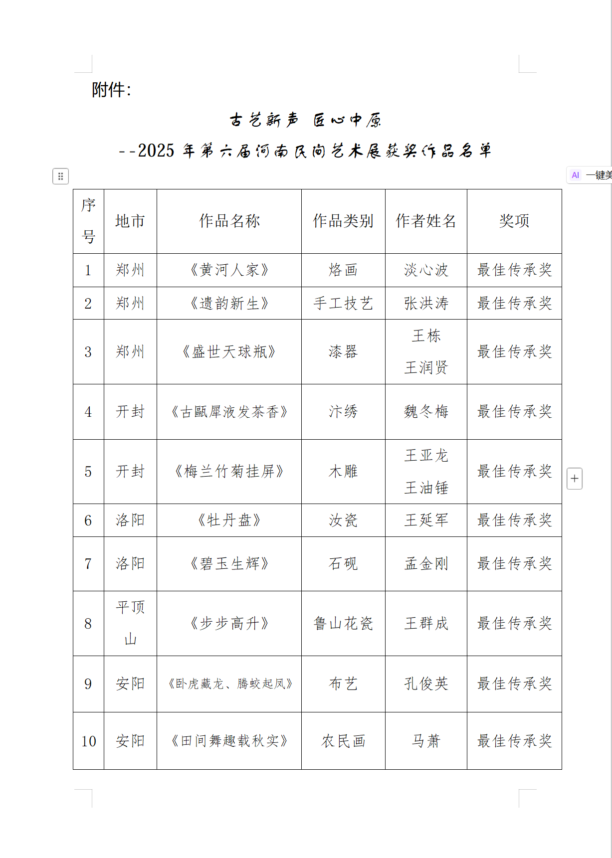 據(jù)悉,根據(jù) 2025 河南惠民文化活動(dòng)總體安排,河南文化館組織開(kāi)展的第六屆河南民間藝術(shù)展作品征集工作,經(jīng)全省縣、市各級(jí)推薦,共收到作品 30 類(lèi) 1500 余件。經(jīng)專家評(píng)審,共評(píng)出最佳傳承獎(jiǎng)20 個(gè),優(yōu)秀獎(jiǎng)40 個(gè),別具匠心獎(jiǎng)60 個(gè),榮譽(yù)參展獎(jiǎng)20 個(gè)。(漯河市廣播電視臺(tái)網(wǎng)絡(luò)部記者:柴全偉)