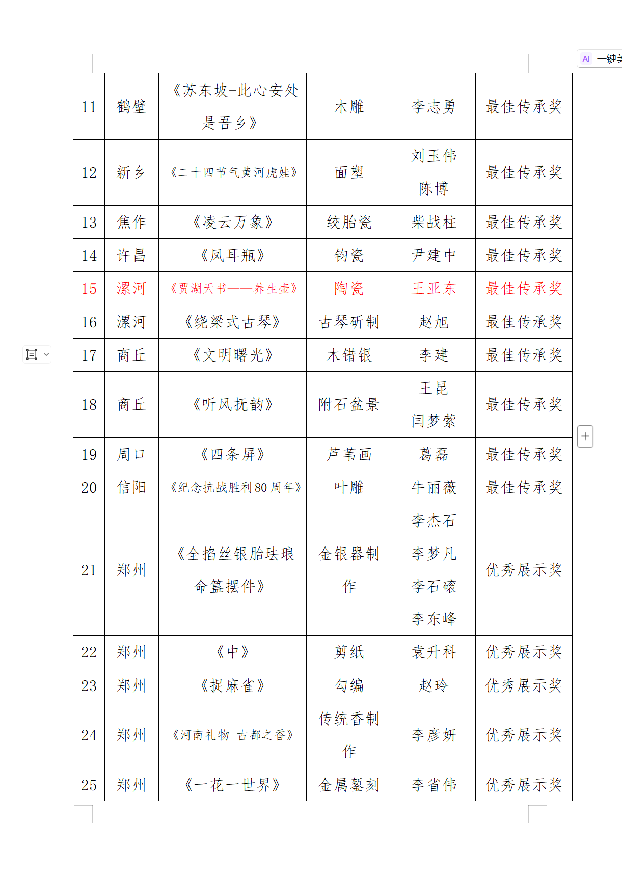 2025 年 12 月 10 日,河南省文化和旅游廳公示 “古藝心聲 匠心中原” 第六屆河南民間藝術(shù)展評(píng)審結(jié)果,漯河市舞陽(yáng)縣文化館選送的《賈湖天書(shū)養(yǎng)生壺》榮獲此次展覽最高獎(jiǎng) ——最佳傳承獎(jiǎng)。