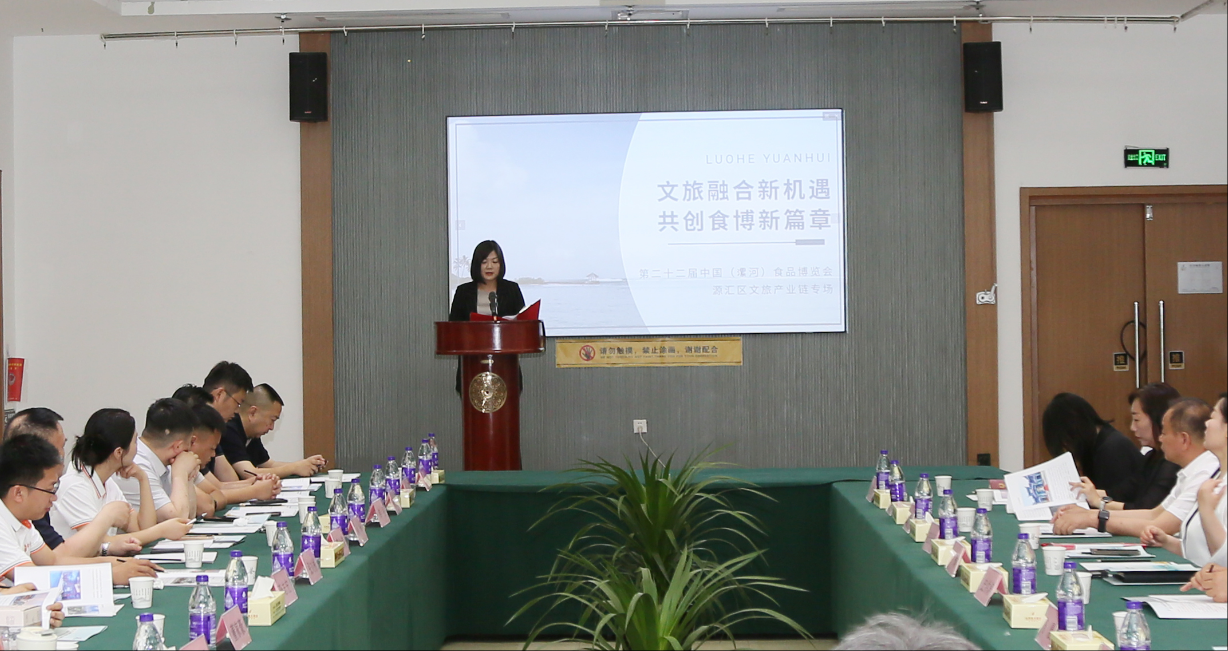 齊琳同志圍繞源匯區(qū)文旅產業(yè)發(fā)展現(xiàn)狀及優(yōu)勢作了專題宣傳推介,簡要介紹近年來源匯區(qū)堅持“文化點亮城市、產業(yè)彰顯特色、創(chuàng)新引領未來”發(fā)展理念,立足“文商旅創(chuàng)融合中心區(qū)”發(fā)展定位,高起點站位、高標準謀劃、高質量推進,做好文旅文創(chuàng)融合文章,積極培育文旅文創(chuàng)消費新業(yè)態(tài)新場景,全力推動文旅產業(yè)鏈項目建設,走出一條以文化人、以文興業(yè)的新路子。最后表示將以此次食博盛會為契機,以文旅融合為抓手,以食品文化為貫穿,依托轄區(qū)河上街景區(qū)和漯灣古鎮(zhèn)超高人氣和特色資源優(yōu)勢,持續(xù)豐富旅游產品和旅游供給,激發(fā)消費潛力,提升文化能級,擦亮文商旅創(chuàng)融合新名片,傾力將源匯區(qū)打造成“在者舒心、來者傾心、聞者動心”的全國知名文化旅游目的地。